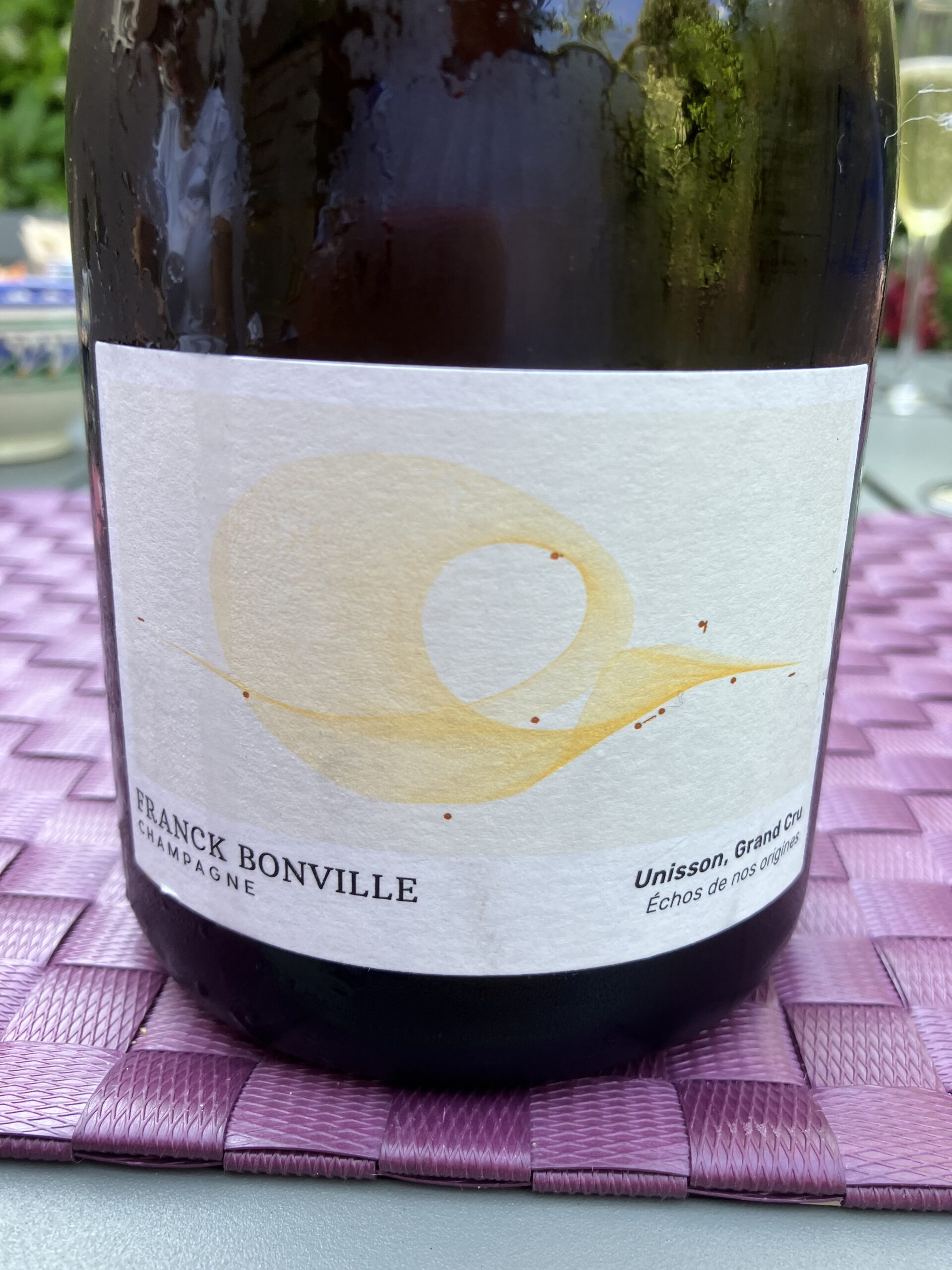 Deze fles Franck Bonville Unisson Champagne Grand Cru Blanc de Blancs Brut kreeg ik cadeau van een gastheer en gastvrouw waar ik een proeverij hield. Zij waren kort daarvoor naar Reims en omstreken geweest en hadden een hele leuke rondleiding en proeverij bij Franck Bonville gehad.